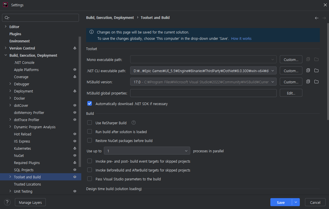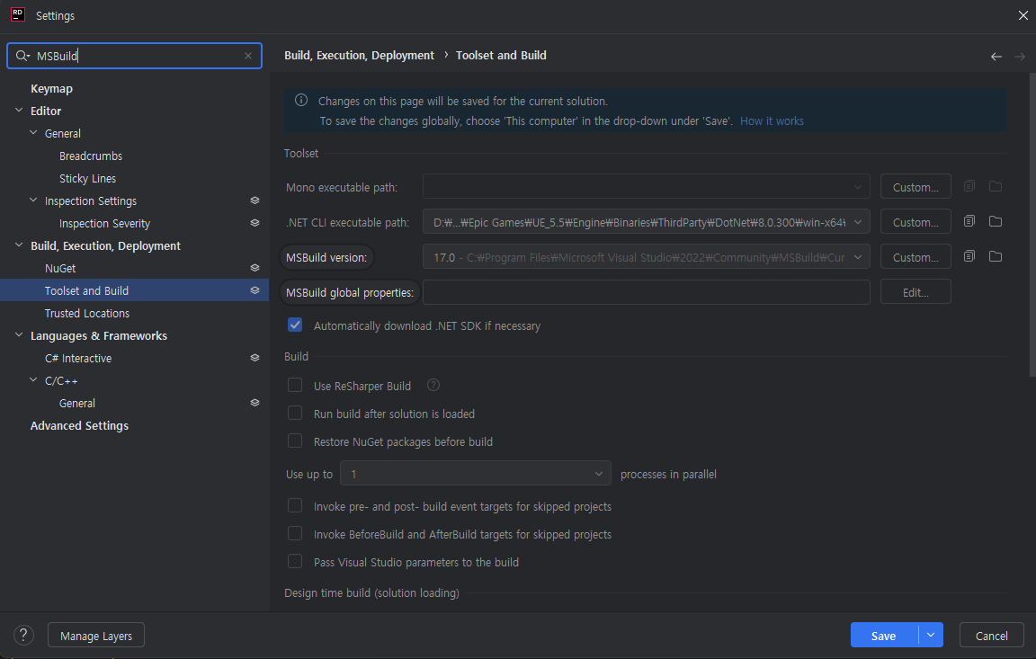 - 언리얼의 .sln파일, .vcxproj을 관리하기 위해서 라이더에서는 프로젝트 초기 설정 단계에서 MSBuild를 사용하는 것