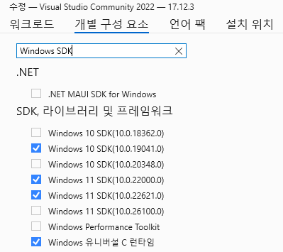 저는 확인해봤었을 때 143이 제대로 설치 되어 있었고, Windows SDK또한 잘 설치되어 있었습니다