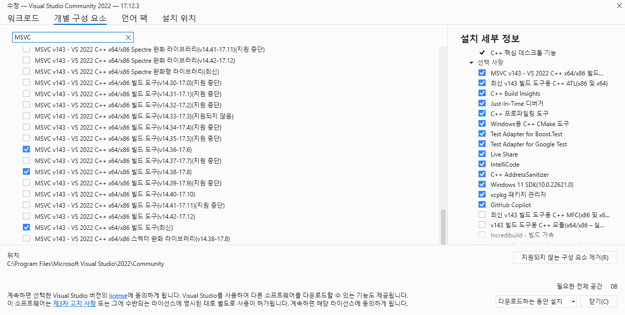 MSVC v143이 설치되어 있는지 확인한다. (각자 컴에 설치된 vs 버전마다 다릅니다. 2022 기준 143 깔려있으면 됨)